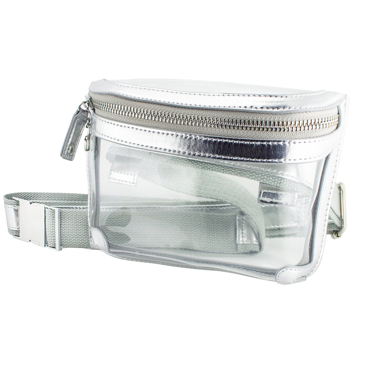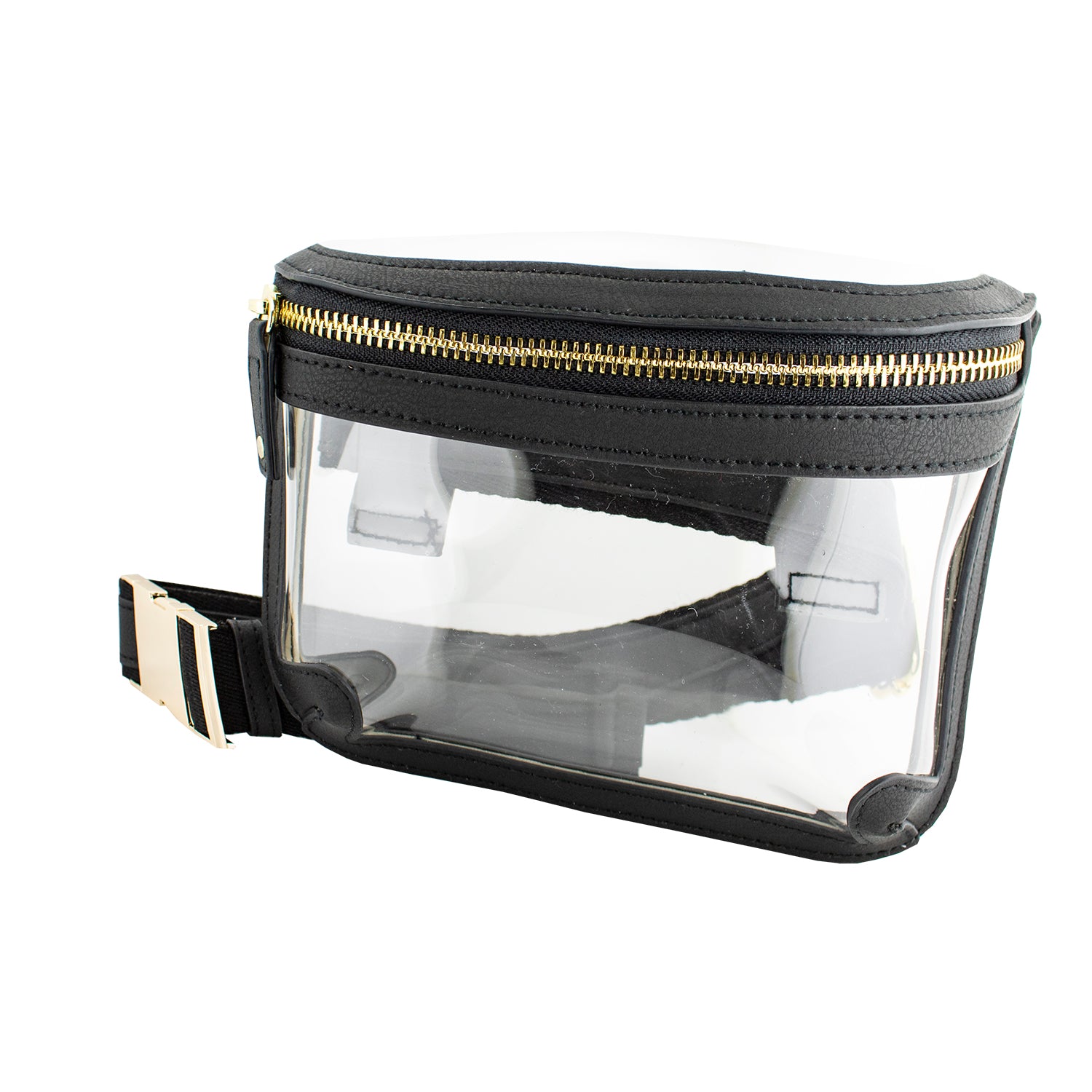 Go hands free with this trending Belt Bag design! The Belt Bag features a clear PVC body with gold hardware and PU Leather accents. The main zippered storage compartment is perfectly sized to fit your cell phone, cash and credit cards, lip gloss, keys, or any small essentials. Secure the belt bag easily around your waist with the cotton webbed and PU leather accented adjustable strap and metal side release buckle.