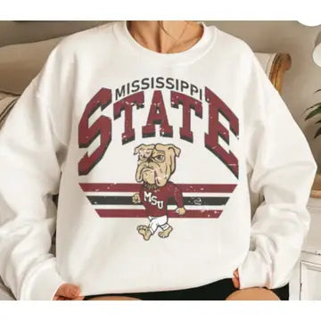 Show your State pride with this classic Mississippi State University crew neck sweatshirt! Crafted from a premium cotton-blend fabric. Featuring the bulldog mascot and the university’s signature maroon and white colors, making it a must-have for any true fan. Whether you're cheering from the stands or staying cozy at home. With its relaxed fit and hem, it provides a timeless look that pairs well with jeans, joggers, or shorts. Gear up for game day or simply show off your school spirit in style!