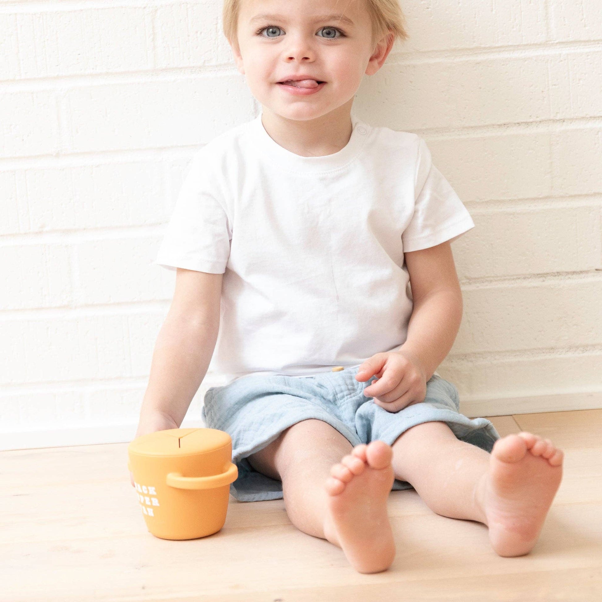 The Happy Snacker is a first-of-its-kind two-piece silicone snack cup with a mess-proof snap-tight lid and soft silicone opening so little hands can easily access food and prevent spills. Designed with easy-grip handles, it fits in car seats and stroller cup holders.