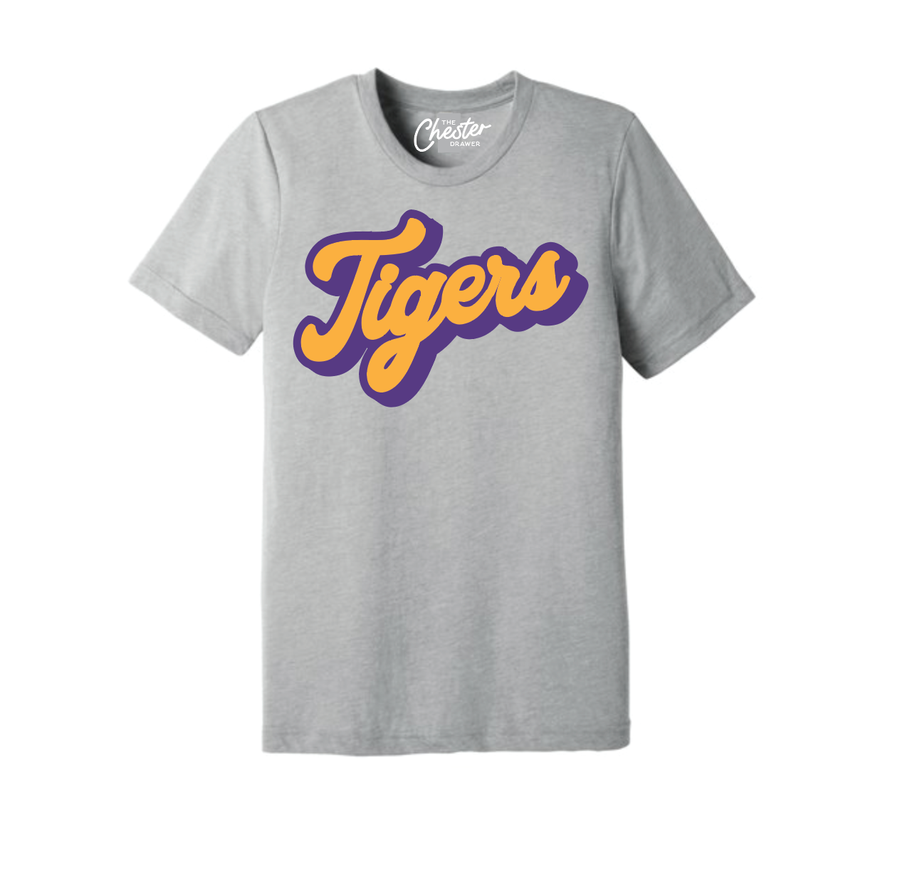 Heather grey short sleeve unisex tee with yellow and purple inks.